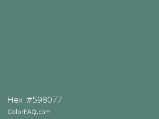 Hex #598077 Color is a normal cyan color and the nearest color is Wintergreen Dream #56887d. Hex code #598077 and RGB value is rgb(89,128,119). In RGB color space, this color is composed of 35% red, 50% green, 47% blue, In CMYK color space, this color is composed of 30% cyan, 0% magenta, 7% yellow , 50% black , In HSL color space, this color has a hue angle of 166° , 18% saturation and 43% lightness.