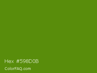 Hex #598d0b Color is a dark green color and the nearest color is Avocado #568203. Hex code #598d0b and RGB value is rgb(89,141,11). In RGB color space, this color is composed of 35% red, 55% green, 4% blue, In CMYK color space, this color is composed of 37% cyan, 0% magenta, 92% yellow , 45% black , In HSL color space, this color has a hue angle of 84° , 86% saturation and 30% lightness.
