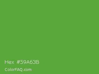 Hex #59a63b Color is a normal green color and the nearest color is Apple #4fa83d. Hex code #59a63b and RGB value is rgb(89,166,59). In RGB color space, this color is composed of 35% red, 65% green, 23% blue, In CMYK color space, this color is composed of 46% cyan, 0% magenta, 64% yellow , 35% black , In HSL color space, this color has a hue angle of 103° , 48% saturation and 44% lightness.