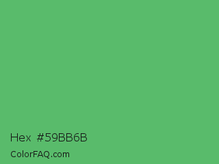Hex #59bb6b Color is a normal green color and the nearest color is Fern #63b76c. Hex code #59bb6b and RGB value is rgb(89,187,107). In RGB color space, this color is composed of 35% red, 73% green, 42% blue, In CMYK color space, this color is composed of 52% cyan, 0% magenta, 43% yellow , 27% black , In HSL color space, this color has a hue angle of 131° , 42% saturation and 54% lightness.