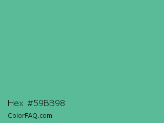 Hex #59bb98 Color is a normal green color and the nearest color is Silver Tree #66b58f. Hex code #59bb98 and RGB value is rgb(89,187,152). In RGB color space, this color is composed of 35% red, 73% green, 60% blue, In CMYK color space, this color is composed of 52% cyan, 0% magenta, 19% yellow , 27% black , In HSL color space, this color has a hue angle of 159° , 42% saturation and 54% lightness.
