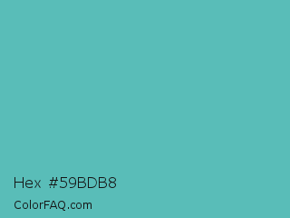Hex #59bdb8 Color is a normal cyan color and the nearest color is Fountain Blue #56b4be. Hex code #59bdb8 and RGB value is rgb(89,189,184). In RGB color space, this color is composed of 35% red, 74% green, 72% blue, In CMYK color space, this color is composed of 53% cyan, 0% magenta, 3% yellow , 26% black , In HSL color space, this color has a hue angle of 177° , 43% saturation and 55% lightness.