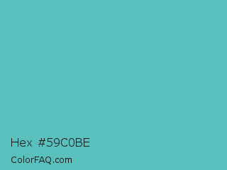 Hex #59c0be Color is a normal cyan color and the nearest color is Fountain Blue #56b4be. Hex code #59c0be and RGB value is rgb(89,192,190). In RGB color space, this color is composed of 35% red, 75% green, 75% blue, In CMYK color space, this color is composed of 54% cyan, 0% magenta, 1% yellow , 25% black , In HSL color space, this color has a hue angle of 179° , 45% saturation and 55% lightness.