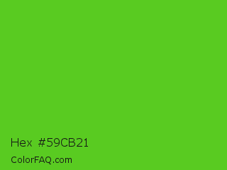 Hex #59cb21 Color is a normal green color and the nearest color is Harlequin Green #46cb18. Hex code #59cb21 and RGB value is rgb(89,203,33). In RGB color space, this color is composed of 35% red, 80% green, 13% blue, In CMYK color space, this color is composed of 56% cyan, 0% magenta, 84% yellow , 20% black , In HSL color space, this color has a hue angle of 100° , 72% saturation and 46% lightness.