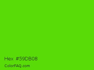 Hex #59db08 Color is a normal green color and the nearest color is Harlequin Green #46cb18. Hex code #59db08 and RGB value is rgb(89,219,8). In RGB color space, this color is composed of 35% red, 86% green, 3% blue, In CMYK color space, this color is composed of 59% cyan, 0% magenta, 96% yellow , 14% black , In HSL color space, this color has a hue angle of 97° , 93% saturation and 45% lightness.