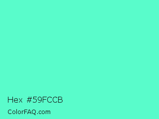 Hex #59fccb Color is a light green color and the nearest color is Turquoise #40e0d0. Hex code #59fccb and RGB value is rgb(89,252,203). In RGB color space, this color is composed of 35% red, 99% green, 80% blue, In CMYK color space, this color is composed of 65% cyan, 0% magenta, 19% yellow , 1% black , In HSL color space, this color has a hue angle of 162° , 96% saturation and 67% lightness.