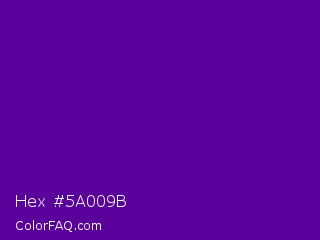 Hex #5a009b Color is a dark purple color and the nearest color is Purple #660099. Hex code #5a009b and RGB value is rgb(90,0,155). In RGB color space, this color is composed of 35% red, 0% green, 61% blue, In CMYK color space, this color is composed of 42% cyan, 100% magenta, 0% yellow , 39% black , In HSL color space, this color has a hue angle of 275° , 100% saturation and 30% lightness.