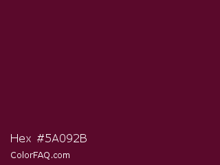 Hex #5a092b Color is a very dark rose color and the nearest color is Mulberry Wood #5c0536. Hex code #5a092b and RGB value is rgb(90,9,43). In RGB color space, this color is composed of 35% red, 4% green, 17% blue, In CMYK color space, this color is composed of 0% cyan, 90% magenta, 52% yellow , 65% black , In HSL color space, this color has a hue angle of 335° , 82% saturation and 19% lightness.