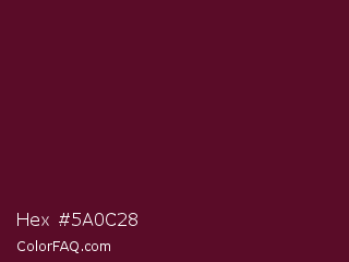 Hex #5a0c28 Color is a very dark rose color and the nearest color is Bordeaux #5c0120. Hex code #5a0c28 and RGB value is rgb(90,12,40). In RGB color space, this color is composed of 35% red, 5% green, 16% blue, In CMYK color space, this color is composed of 0% cyan, 87% magenta, 56% yellow , 65% black , In HSL color space, this color has a hue angle of 338° , 76% saturation and 20% lightness.