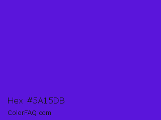 Hex #5a15db Color is a normal violet color and the nearest color is Han Purple #5218fa. Hex code #5a15db and RGB value is rgb(90,21,219). In RGB color space, this color is composed of 35% red, 8% green, 86% blue, In CMYK color space, this color is composed of 59% cyan, 90% magenta, 0% yellow , 14% black , In HSL color space, this color has a hue angle of 261° , 83% saturation and 47% lightness.
