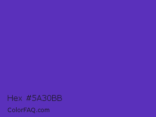 Hex #5a30bb Color is a normal indigo color and the nearest color is Purple Heart Crayola #652dc1. Hex code #5a30bb and RGB value is rgb(90,48,187). In RGB color space, this color is composed of 35% red, 19% green, 73% blue, In CMYK color space, this color is composed of 52% cyan, 74% magenta, 0% yellow , 27% black , In HSL color space, this color has a hue angle of 258° , 59% saturation and 46% lightness.