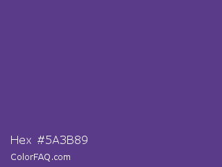 Hex #5a3b89 Color is a normal violet color and the nearest color is Blue Magenta Violet #553592. Hex code #5a3b89 and RGB value is rgb(90,59,137). In RGB color space, this color is composed of 35% red, 23% green, 54% blue, In CMYK color space, this color is composed of 34% cyan, 57% magenta, 0% yellow , 46% black , In HSL color space, this color has a hue angle of 264° , 40% saturation and 38% lightness.