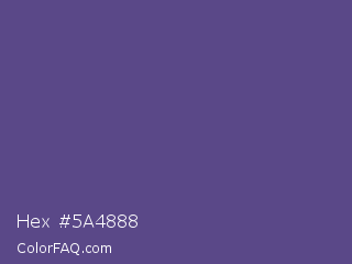 Hex #5a4888 Color is a normal indigo color and the nearest color is Victoria #534491. Hex code #5a4888 and RGB value is rgb(90,72,136). In RGB color space, this color is composed of 35% red, 28% green, 53% blue, In CMYK color space, this color is composed of 34% cyan, 47% magenta, 0% yellow , 47% black , In HSL color space, this color has a hue angle of 257° , 31% saturation and 41% lightness.