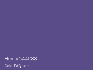 Hex #5a4c88 Color is a normal indigo color and the nearest color is Victoria #534491. Hex code #5a4c88 and RGB value is rgb(90,76,136). In RGB color space, this color is composed of 35% red, 30% green, 53% blue, In CMYK color space, this color is composed of 34% cyan, 44% magenta, 0% yellow , 47% black , In HSL color space, this color has a hue angle of 254° , 28% saturation and 42% lightness.