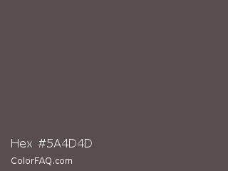 Hex #5a4d4d Color is a normal red color and the nearest color is Don Juan #5d4c51. Hex code #5a4d4d and RGB value is rgb(90,77,77). In RGB color space, this color is composed of 35% red, 30% green, 30% blue, In CMYK color space, this color is composed of 0% cyan, 14% magenta, 14% yellow , 65% black , In HSL color space, this color has a hue angle of 0° , 8% saturation and 33% lightness.