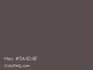 Hex #5a4d4e Color is a normal red color and the nearest color is Don Juan #5d4c51. Hex code #5a4d4e and RGB value is rgb(90,77,78). In RGB color space, this color is composed of 35% red, 30% green, 31% blue, In CMYK color space, this color is composed of 0% cyan, 14% magenta, 13% yellow , 65% black , In HSL color space, this color has a hue angle of 355° , 8% saturation and 33% lightness.