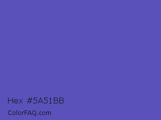 Hex #5a51bb Color is a normal indigo color and the nearest color is Blue Violet #6456b7. Hex code #5a51bb and RGB value is rgb(90,81,187). In RGB color space, this color is composed of 35% red, 32% green, 73% blue, In CMYK color space, this color is composed of 52% cyan, 57% magenta, 0% yellow , 27% black , In HSL color space, this color has a hue angle of 245° , 44% saturation and 53% lightness.
