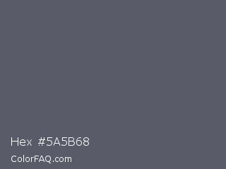 Hex #5a5b68 Color is a normal blue color and the nearest color is Scarpa Flow #585562. Hex code #5a5b68 and RGB value is rgb(90,91,104). In RGB color space, this color is composed of 35% red, 36% green, 41% blue, In CMYK color space, this color is composed of 13% cyan, 13% magenta, 0% yellow , 59% black , In HSL color space, this color has a hue angle of 236° , 7% saturation and 38% lightness.