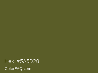 Hex #5a5d28 Color is a dark yellow color and the nearest color is Costa Del Sol #615d30. Hex code #5a5d28 and RGB value is rgb(90,93,40). In RGB color space, this color is composed of 35% red, 36% green, 16% blue, In CMYK color space, this color is composed of 3% cyan, 0% magenta, 57% yellow , 64% black , In HSL color space, this color has a hue angle of 63° , 40% saturation and 26% lightness.