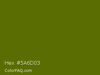 Hex #5a6d03 Color is a very dark lime color and the nearest color is Avocado #568203. Hex code #5a6d03 and RGB value is rgb(90,109,3). In RGB color space, this color is composed of 35% red, 43% green, 1% blue, In CMYK color space, this color is composed of 17% cyan, 0% magenta, 97% yellow , 57% black , In HSL color space, this color has a hue angle of 71° , 95% saturation and 22% lightness.