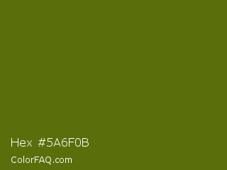 Hex #5a6f0b Color is a dark lime color and the nearest color is Avocado #568203. Hex code #5a6f0b and RGB value is rgb(90,111,11). In RGB color space, this color is composed of 35% red, 44% green, 4% blue, In CMYK color space, this color is composed of 19% cyan, 0% magenta, 90% yellow , 56% black , In HSL color space, this color has a hue angle of 73° , 82% saturation and 24% lightness.