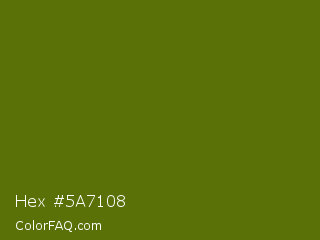 Hex #5a7108 Color is a dark lime color and the nearest color is Avocado #568203. Hex code #5a7108 and RGB value is rgb(90,113,8). In RGB color space, this color is composed of 35% red, 44% green, 3% blue, In CMYK color space, this color is composed of 20% cyan, 0% magenta, 93% yellow , 56% black , In HSL color space, this color has a hue angle of 73° , 87% saturation and 24% lightness.