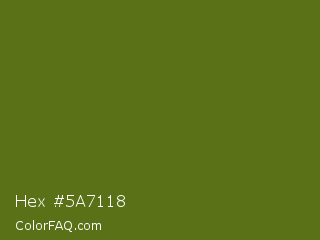 Hex #5a7118 Color is a dark lime color and the nearest color is Fern Frond #657220. Hex code #5a7118 and RGB value is rgb(90,113,24). In RGB color space, this color is composed of 35% red, 44% green, 9% blue, In CMYK color space, this color is composed of 20% cyan, 0% magenta, 79% yellow , 56% black , In HSL color space, this color has a hue angle of 76° , 65% saturation and 27% lightness.