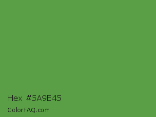 Hex #5a9e45 Color is a normal green color and the nearest color is Apple #4fa83d. Hex code #5a9e45 and RGB value is rgb(90,158,69). In RGB color space, this color is composed of 35% red, 62% green, 27% blue, In CMYK color space, this color is composed of 43% cyan, 0% magenta, 56% yellow , 38% black , In HSL color space, this color has a hue angle of 106° , 39% saturation and 45% lightness.