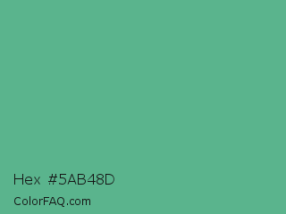 Hex #5ab48d Color is a normal green color and the nearest color is Silver Tree #66b58f. Hex code #5ab48d and RGB value is rgb(90,180,141). In RGB color space, this color is composed of 35% red, 71% green, 55% blue, In CMYK color space, this color is composed of 50% cyan, 0% magenta, 22% yellow , 29% black , In HSL color space, this color has a hue angle of 154° , 38% saturation and 53% lightness.