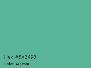 Hex #5ab498 Color is a normal green color and the nearest color is Silver Tree #66b58f. Hex code #5ab498 and RGB value is rgb(90,180,152). In RGB color space, this color is composed of 35% red, 71% green, 60% blue, In CMYK color space, this color is composed of 50% cyan, 0% magenta, 16% yellow , 29% black , In HSL color space, this color has a hue angle of 161° , 38% saturation and 53% lightness.