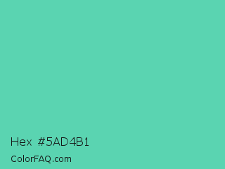 Hex #5ad4b1 Color is a normal green color and the nearest color is Medium Aquamarine #66ddaa. Hex code #5ad4b1 and RGB value is rgb(90,212,177). In RGB color space, this color is composed of 35% red, 83% green, 69% blue, In CMYK color space, this color is composed of 58% cyan, 0% magenta, 17% yellow , 17% black , In HSL color space, this color has a hue angle of 163° , 59% saturation and 59% lightness.