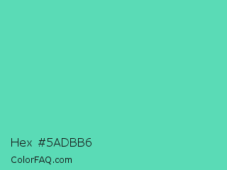 Hex #5adbb6 Color is a light green color and the nearest color is Medium Aquamarine #66ddaa. Hex code #5adbb6 and RGB value is rgb(90,219,182). In RGB color space, this color is composed of 35% red, 86% green, 71% blue, In CMYK color space, this color is composed of 59% cyan, 0% magenta, 17% yellow , 14% black , In HSL color space, this color has a hue angle of 163° , 64% saturation and 61% lightness.