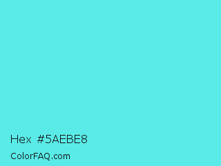 Hex #5aebe8 Color is a light cyan color and the nearest color is Turquoise Blue #6cdae7. Hex code #5aebe8 and RGB value is rgb(90,235,232). In RGB color space, this color is composed of 35% red, 92% green, 91% blue, In CMYK color space, this color is composed of 62% cyan, 0% magenta, 1% yellow , 8% black , In HSL color space, this color has a hue angle of 179° , 78% saturation and 64% lightness.