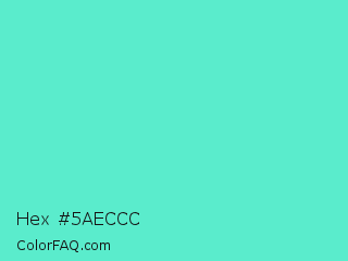 Hex #5aeccc Color is a light cyan color and the nearest color is Turquoise #40e0d0. Hex code #5aeccc and RGB value is rgb(90,236,204). In RGB color space, this color is composed of 35% red, 93% green, 80% blue, In CMYK color space, this color is composed of 62% cyan, 0% magenta, 14% yellow , 7% black , In HSL color space, this color has a hue angle of 167° , 79% saturation and 64% lightness.
