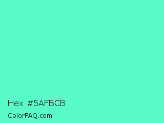 Hex #5afbcb Color is a light green color and the nearest color is Turquoise #40e0d0. Hex code #5afbcb and RGB value is rgb(90,251,203). In RGB color space, this color is composed of 35% red, 98% green, 80% blue, In CMYK color space, this color is composed of 64% cyan, 0% magenta, 19% yellow , 2% black , In HSL color space, this color has a hue angle of 162° , 95% saturation and 67% lightness.