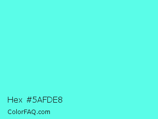 Hex #5afde8 Color is a light cyan color and the nearest color is Turquoise Blue #6cdae7. Hex code #5afde8 and RGB value is rgb(90,253,232). In RGB color space, this color is composed of 35% red, 99% green, 91% blue, In CMYK color space, this color is composed of 64% cyan, 0% magenta, 8% yellow , 1% black , In HSL color space, this color has a hue angle of 172° , 98% saturation and 67% lightness.