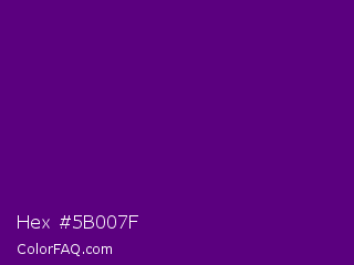 Hex #5b007f Color is a dark purple color and the nearest color is Pigment Indigo #4b0082. Hex code #5b007f and RGB value is rgb(91,0,127). In RGB color space, this color is composed of 36% red, 0% green, 50% blue, In CMYK color space, this color is composed of 28% cyan, 100% magenta, 0% yellow , 50% black , In HSL color space, this color has a hue angle of 283° , 100% saturation and 25% lightness.