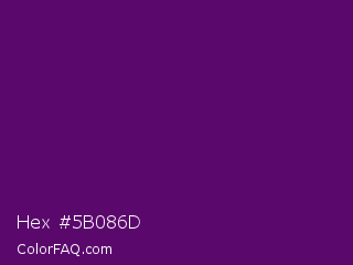 Hex #5b086d Color is a dark purple color and the nearest color is Honey Flower #4f1c70. Hex code #5b086d and RGB value is rgb(91,8,109). In RGB color space, this color is composed of 36% red, 3% green, 43% blue, In CMYK color space, this color is composed of 17% cyan, 93% magenta, 0% yellow , 57% black , In HSL color space, this color has a hue angle of 289° , 86% saturation and 23% lightness.