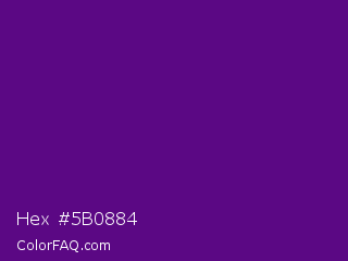 Hex #5b0884 Color is a dark purple color and the nearest color is Pigment Indigo #4b0082. Hex code #5b0884 and RGB value is rgb(91,8,132). In RGB color space, this color is composed of 36% red, 3% green, 52% blue, In CMYK color space, this color is composed of 31% cyan, 94% magenta, 0% yellow , 48% black , In HSL color space, this color has a hue angle of 280° , 89% saturation and 27% lightness.