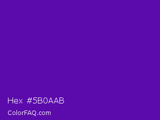 Hex #5b0aab Color is a normal violet color and the nearest color is Purple #660099. Hex code #5b0aab and RGB value is rgb(91,10,171). In RGB color space, this color is composed of 36% red, 4% green, 67% blue, In CMYK color space, this color is composed of 47% cyan, 94% magenta, 0% yellow , 33% black , In HSL color space, this color has a hue angle of 270° , 89% saturation and 35% lightness.
