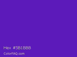 Hex #5b1bbb Color is a normal violet color and the nearest color is Purple Heart Crayola #652dc1. Hex code #5b1bbb and RGB value is rgb(91,27,187). In RGB color space, this color is composed of 36% red, 11% green, 73% blue, In CMYK color space, this color is composed of 51% cyan, 86% magenta, 0% yellow , 27% black , In HSL color space, this color has a hue angle of 264° , 75% saturation and 42% lightness.