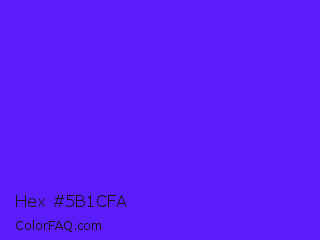 Hex #5b1cfa Color is a normal indigo color and the nearest color is Han Purple #5218fa. Hex code #5b1cfa and RGB value is rgb(91,28,250). In RGB color space, this color is composed of 36% red, 11% green, 98% blue, In CMYK color space, this color is composed of 64% cyan, 89% magenta, 0% yellow , 2% black , In HSL color space, this color has a hue angle of 257° , 96% saturation and 55% lightness.