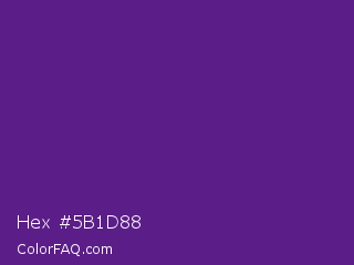 Hex #5b1d88 Color is a normal purple color and the nearest color is KSU Purple #512888. Hex code #5b1d88 and RGB value is rgb(91,29,136). In RGB color space, this color is composed of 36% red, 11% green, 53% blue, In CMYK color space, this color is composed of 33% cyan, 79% magenta, 0% yellow , 47% black , In HSL color space, this color has a hue angle of 275° , 65% saturation and 32% lightness.