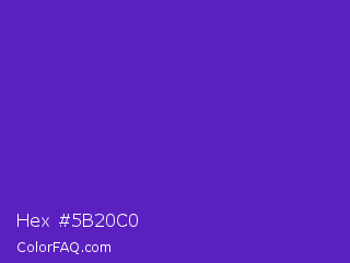 Hex #5b20c0 Color is a normal violet color and the nearest color is Purple Heart Crayola #652dc1. Hex code #5b20c0 and RGB value is rgb(91,32,192). In RGB color space, this color is composed of 36% red, 13% green, 75% blue, In CMYK color space, this color is composed of 53% cyan, 83% magenta, 0% yellow , 25% black , In HSL color space, this color has a hue angle of 262° , 71% saturation and 44% lightness.