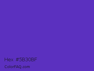 Hex #5b30bf Color is a normal indigo color and the nearest color is Purple Heart Crayola #652dc1. Hex code #5b30bf and RGB value is rgb(91,48,191). In RGB color space, this color is composed of 36% red, 19% green, 75% blue, In CMYK color space, this color is composed of 52% cyan, 75% magenta, 0% yellow , 25% black , In HSL color space, this color has a hue angle of 258° , 60% saturation and 47% lightness.