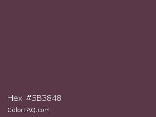 Hex #5b3848 Color is a dark rose color and the nearest color is Dark Byzantium #5d3954. Hex code #5b3848 and RGB value is rgb(91,56,72). In RGB color space, this color is composed of 36% red, 22% green, 28% blue, In CMYK color space, this color is composed of 0% cyan, 38% magenta, 21% yellow , 64% black , In HSL color space, this color has a hue angle of 333° , 24% saturation and 29% lightness.