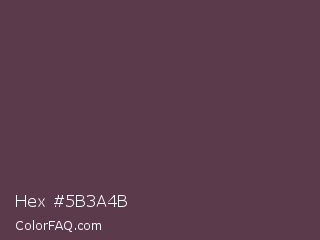 Hex #5b3a4b Color is a dark rose color and the nearest color is Dark Byzantium #5d3954. Hex code #5b3a4b and RGB value is rgb(91,58,75). In RGB color space, this color is composed of 36% red, 23% green, 29% blue, In CMYK color space, this color is composed of 0% cyan, 36% magenta, 18% yellow , 64% black , In HSL color space, this color has a hue angle of 329° , 22% saturation and 29% lightness.