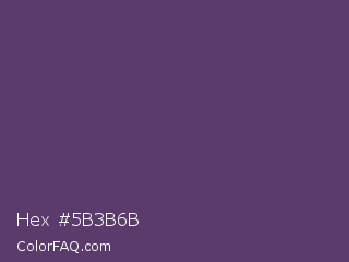 Hex #5b3b6b Color is a normal purple color and the nearest color is Imperial #602f6b. Hex code #5b3b6b and RGB value is rgb(91,59,107). In RGB color space, this color is composed of 36% red, 23% green, 42% blue, In CMYK color space, this color is composed of 15% cyan, 45% magenta, 0% yellow , 58% black , In HSL color space, this color has a hue angle of 280° , 29% saturation and 33% lightness.