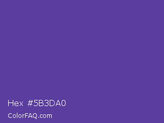 Hex #5b3da0 Color is a normal indigo color and the nearest color is Gigas #523c94. Hex code #5b3da0 and RGB value is rgb(91,61,160). In RGB color space, this color is composed of 36% red, 24% green, 63% blue, In CMYK color space, this color is composed of 43% cyan, 62% magenta, 0% yellow , 37% black , In HSL color space, this color has a hue angle of 258° , 45% saturation and 43% lightness.