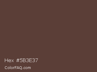 Hex #5b3e37 Color is a dark red color and the nearest color is Dark Liver Horses #543d37. Hex code #5b3e37 and RGB value is rgb(91,62,55). In RGB color space, this color is composed of 36% red, 24% green, 22% blue, In CMYK color space, this color is composed of 0% cyan, 32% magenta, 40% yellow , 64% black , In HSL color space, this color has a hue angle of 12° , 25% saturation and 29% lightness.